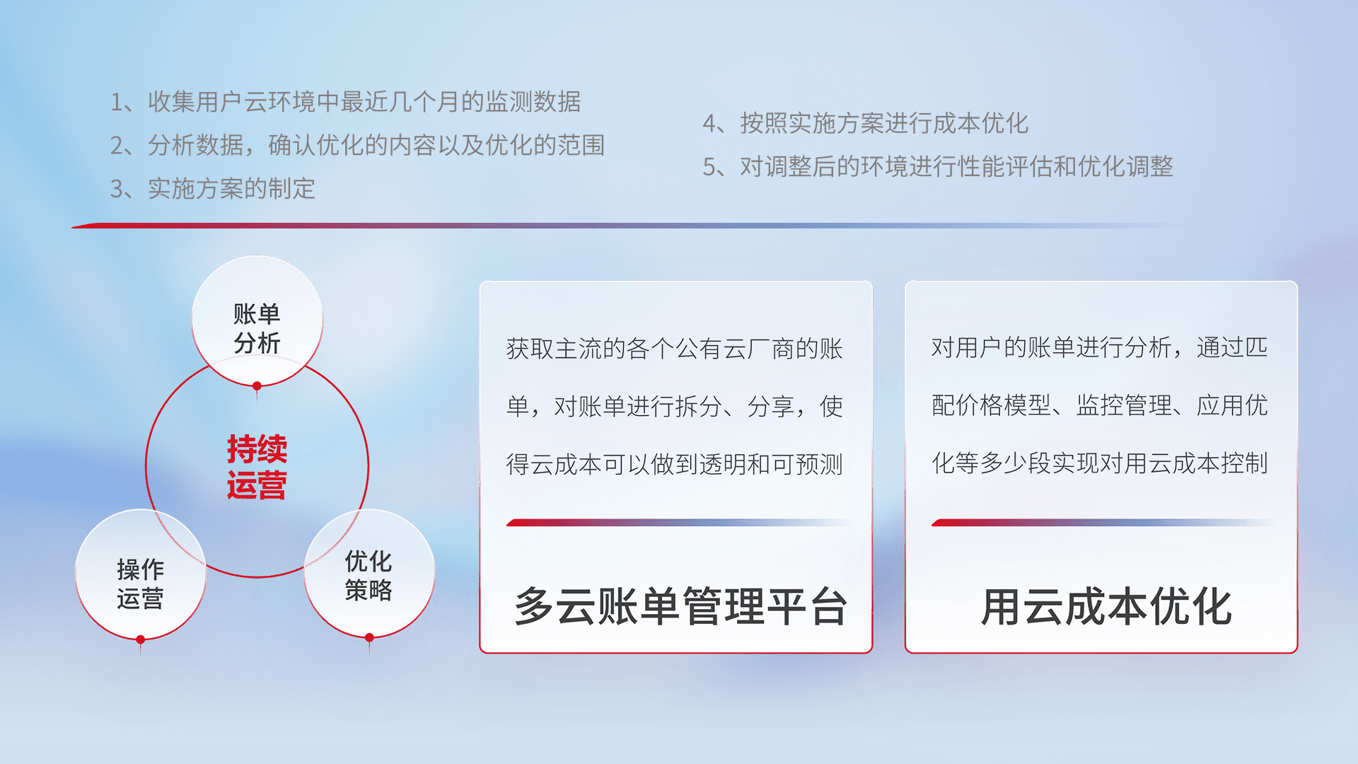通过多云纳管,,,,以统一的资源数据模型把客户的云资源进行抽象和封装,,,,进而实现对多云资源的统一操作,,,保障云资源管理的可靠性、、、稳定性与可用性。。量身定制化运维内容,,配置、、、、开发运维、、补丁管理、、备份、、、、监控、、认证和访问管理、、、、审计和日常巡检等,,保障在用云过程中的可靠度,,稳定度以及高可用率。。。。