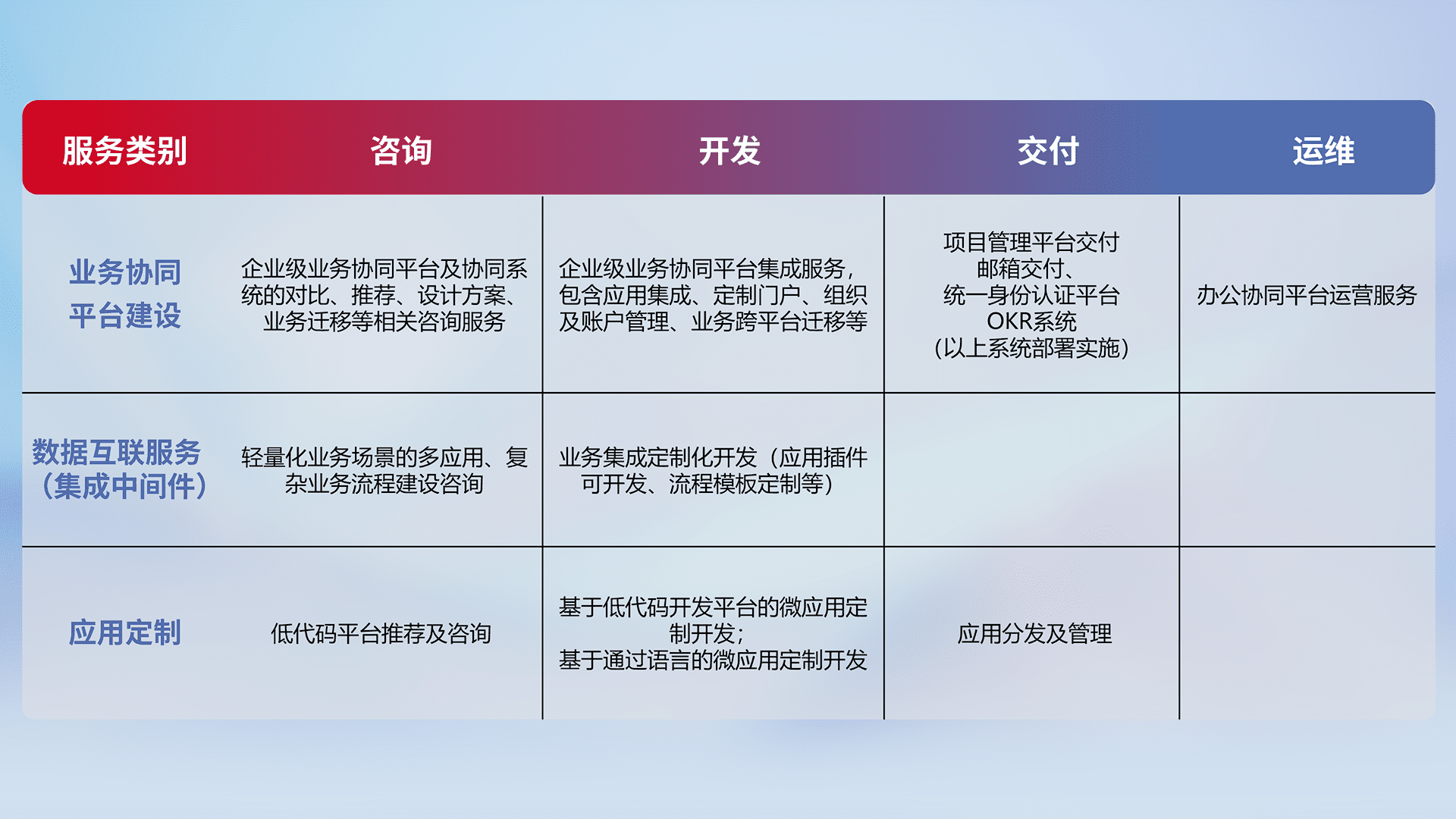 针对钉钉、、、、企微、、、IDaas等平台级产品提供产品的规划、、、方案、、、、交付、、定制化开发等服务,,实现如统一协同办公、、、智能客户服务、、、、混合会议管理、、智能数据查询、、等业务场景,,,,实现数字化转型。。。。